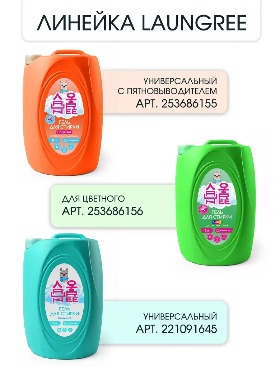 Гель для стирки laungree - эффективное и экономичное средство, разработанное в России для стирки разного типа белья. Гель мгновенно удаляет самые сложные пятна и загрязнения, сохраняя первоначальный цвет, яркость и структуру тканей, а также предотвращает образование «катышков».