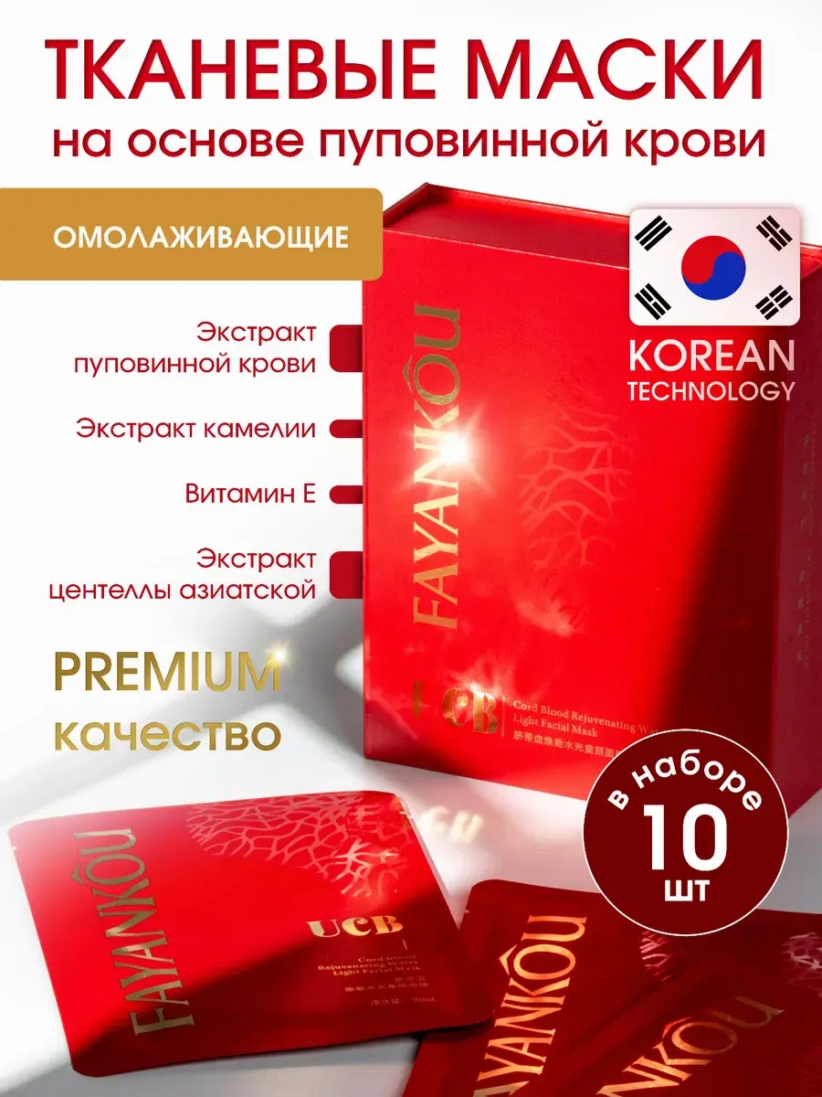 Набор из 10 премиальных тканевых масок для лица от корейской фирмы Fayankou омолаживающие на основе пуповинной крови, идеальны для ежедневного ухода за кожей лица. Косметические масочки обогащены уникальным составом, включающим экстракт пуповинной крови способствует обновлению клеток, помогает бороться с первыми признаками старения, экстракт камелии обладает успокаивающим и увлажняющим действием, коллаген повышает упругость и эластичность кожи и экстракт центеллы азиатской способствует заживлению и укреплению кожи. Эти компоненты эффективно питают и увлажняют кожу, помогают снять отечность и придать ей здоровый и сияющий вид.